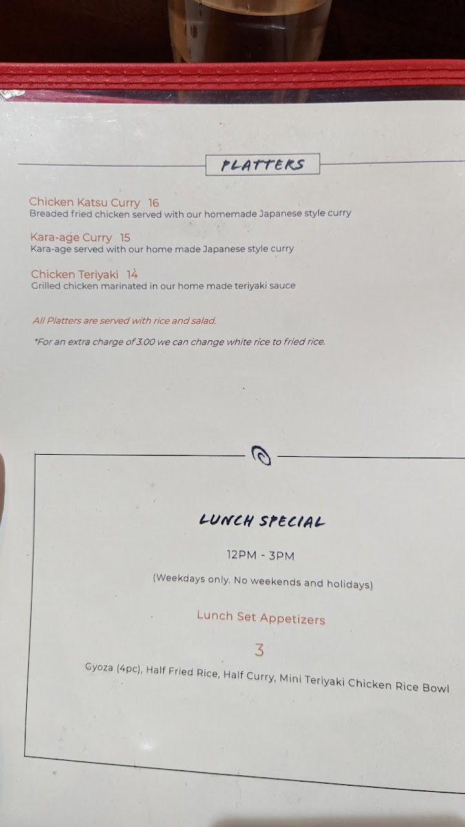 - KaraAge Curry Platter - Crispy fried chicken paired with homemade curry, rice, and salad for just $20.00.