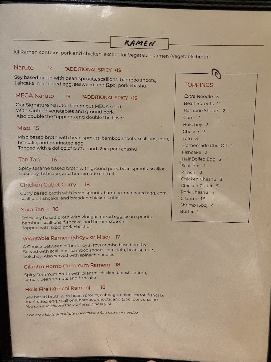 Our Signature Spicy Naruto Ramen with sauteed vegetables and ground pork. Also double the toppings and flavor.